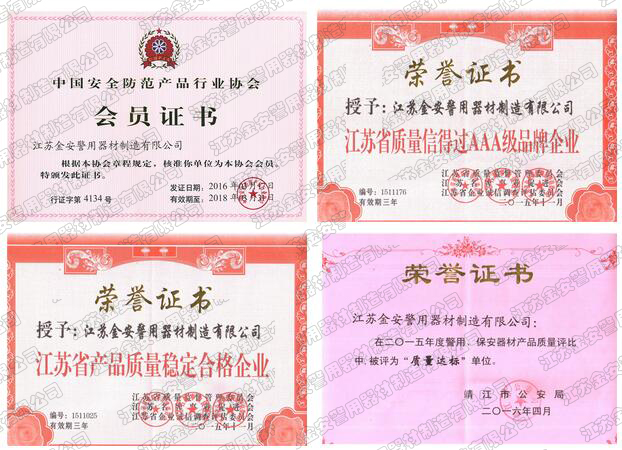第一批新型單警裝備定點生產企業 公安部警用裝備采購中心協議供貨單位 公安部防彈防刺服生產定點企業 江蘇省公安廳防彈衣入圍企業 江蘇警用裝備行業協會會員單位 中國刑事科學技術協會團隊會員單位 中國安全防范產品行業協會會員單位 靖江市保安器材行業協會常務理事單位 全國警用裝備標準化技術委員會通訊委員 江蘇金安警用器材制造有限公司始創于九十年代初,公安部防彈防刺服生產定點企業、公安部警用裝備采購中心2..